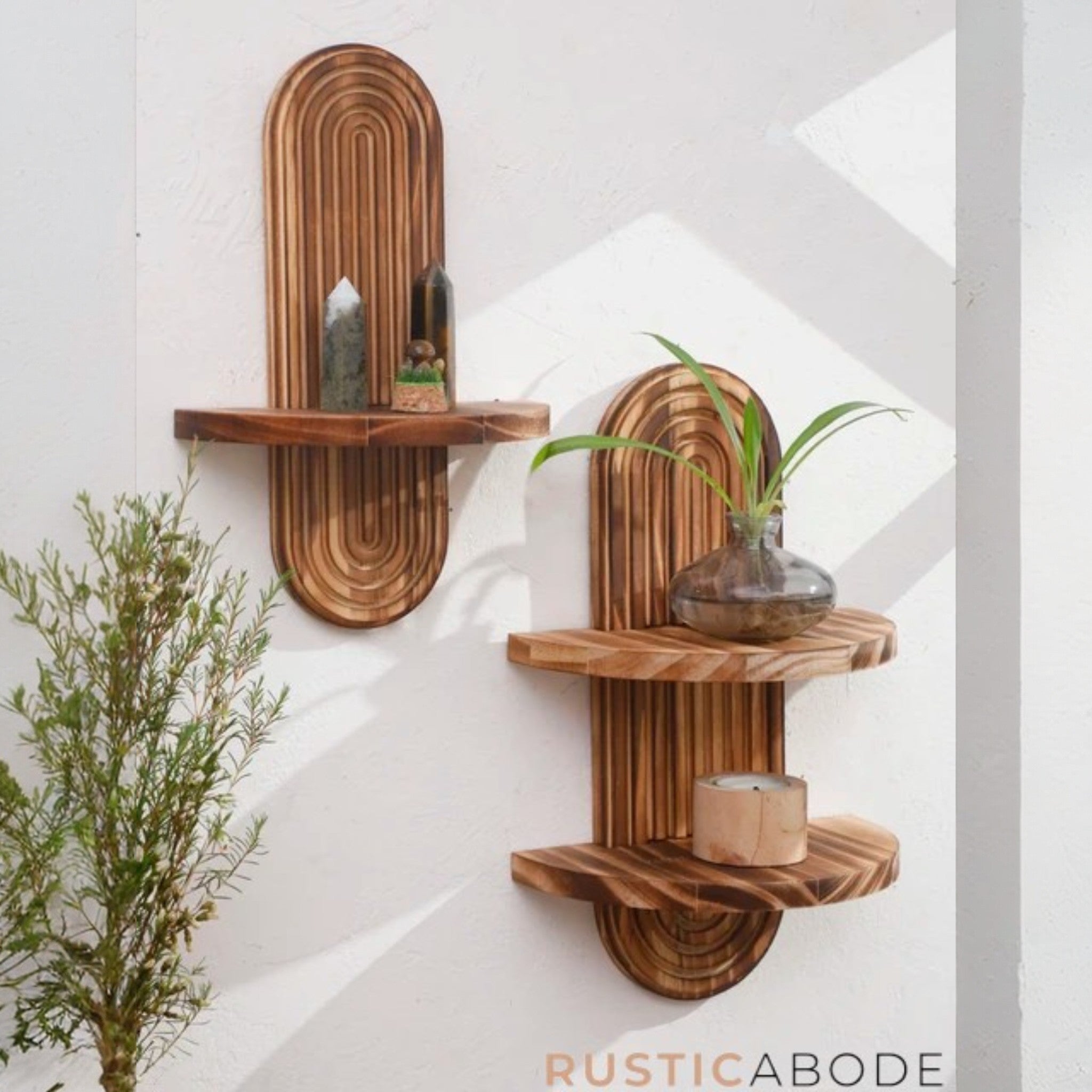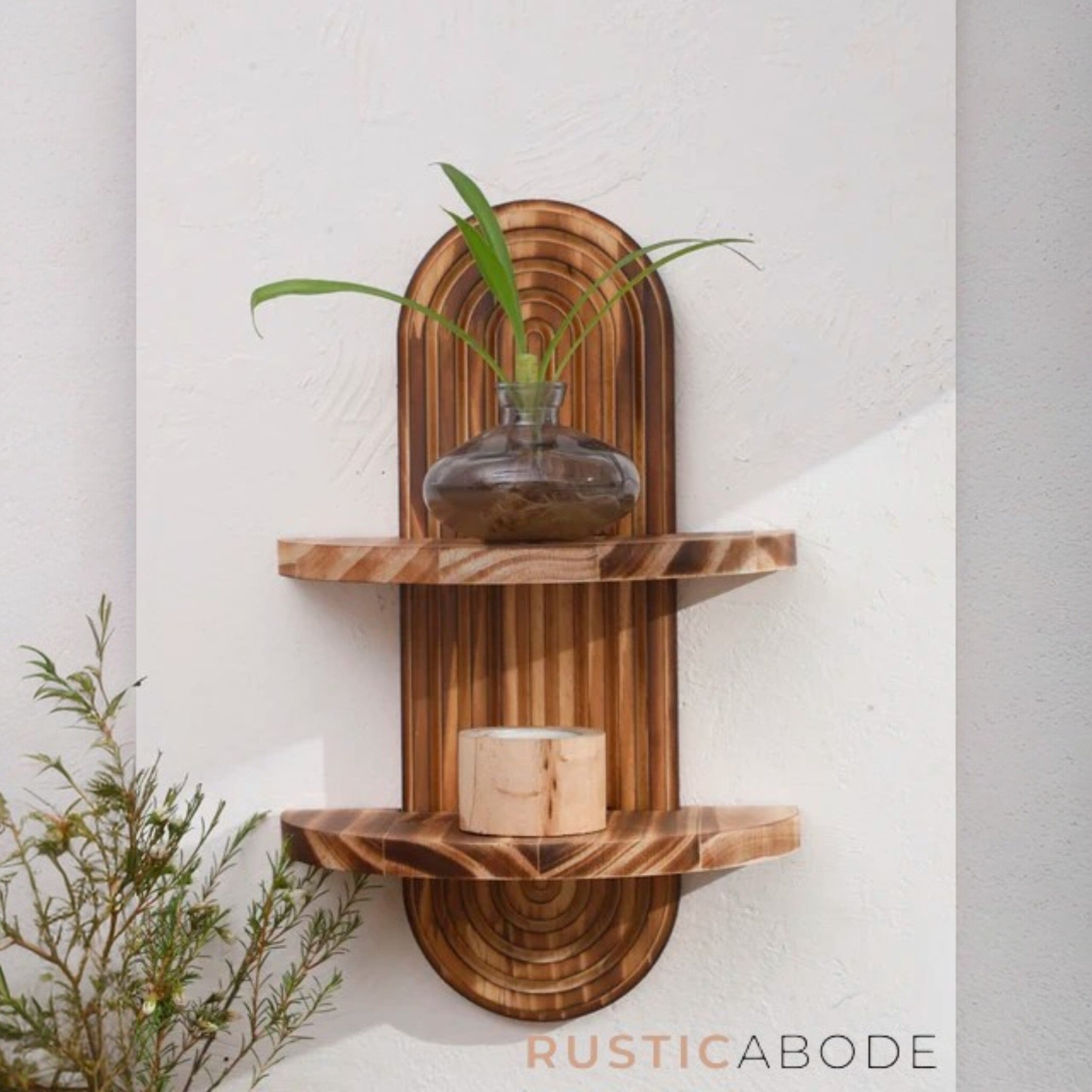 A statement piece that blends natural wood with a unique design. Perfect for displaying plants, candles, or treasured décor, making your walls both stylish and practical.